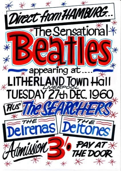 Quarry Bank Grammar (2 years). John Lennon was there too but he was two years older and I never met him, but I briefly saw the Beatles performing at Litherland Town Hall (LTH) in 1960 … they were very loud and I left early. On the way out, I looked up at the stage and saw (I think) five (but it may have been four) black leather-jacketed individuals. The ‘Beatles Bible’ (Not quite as popular as Jesus) website has an excellent and enlightening article on this landmark LTH performance and I have reproduced the poster for it on the right.